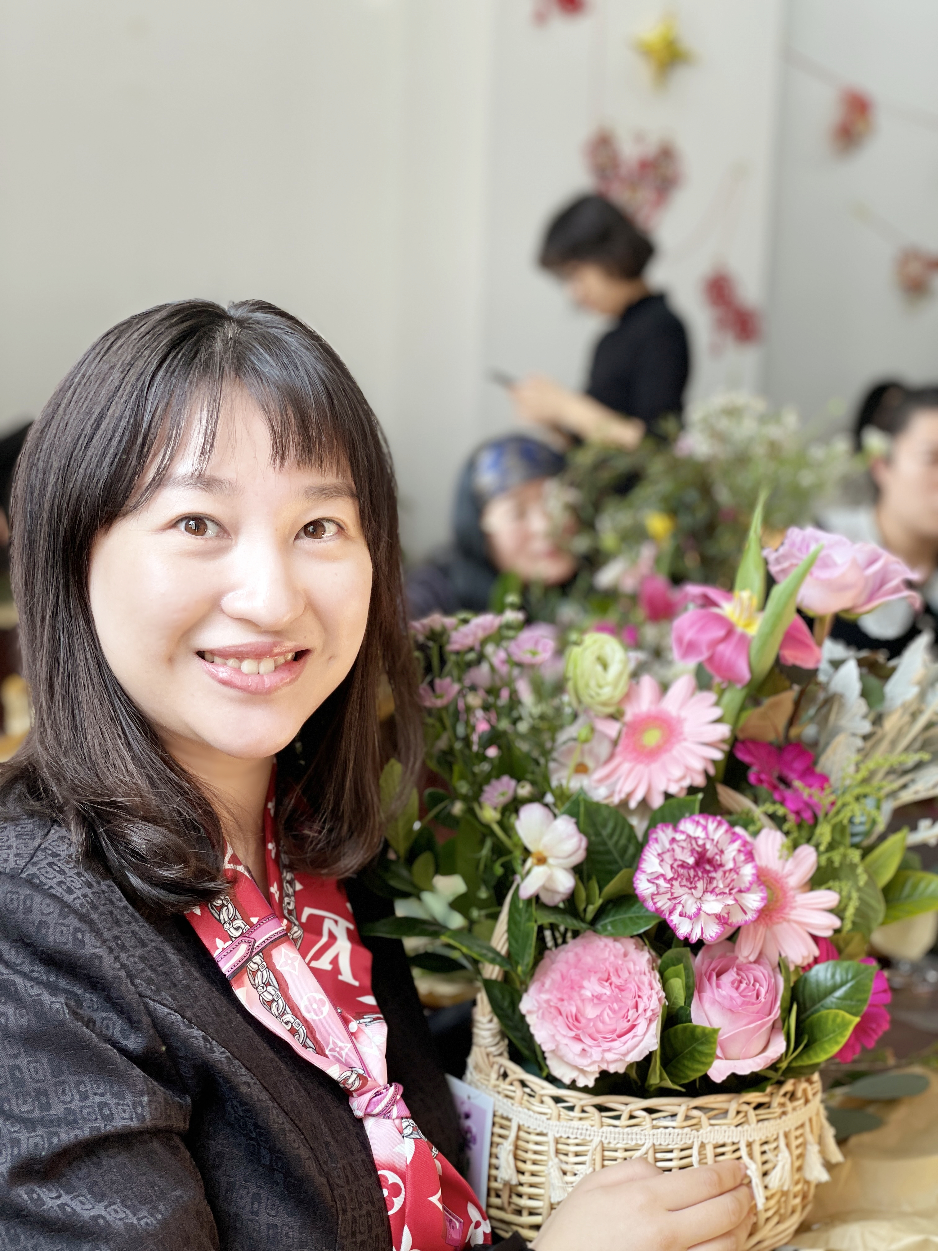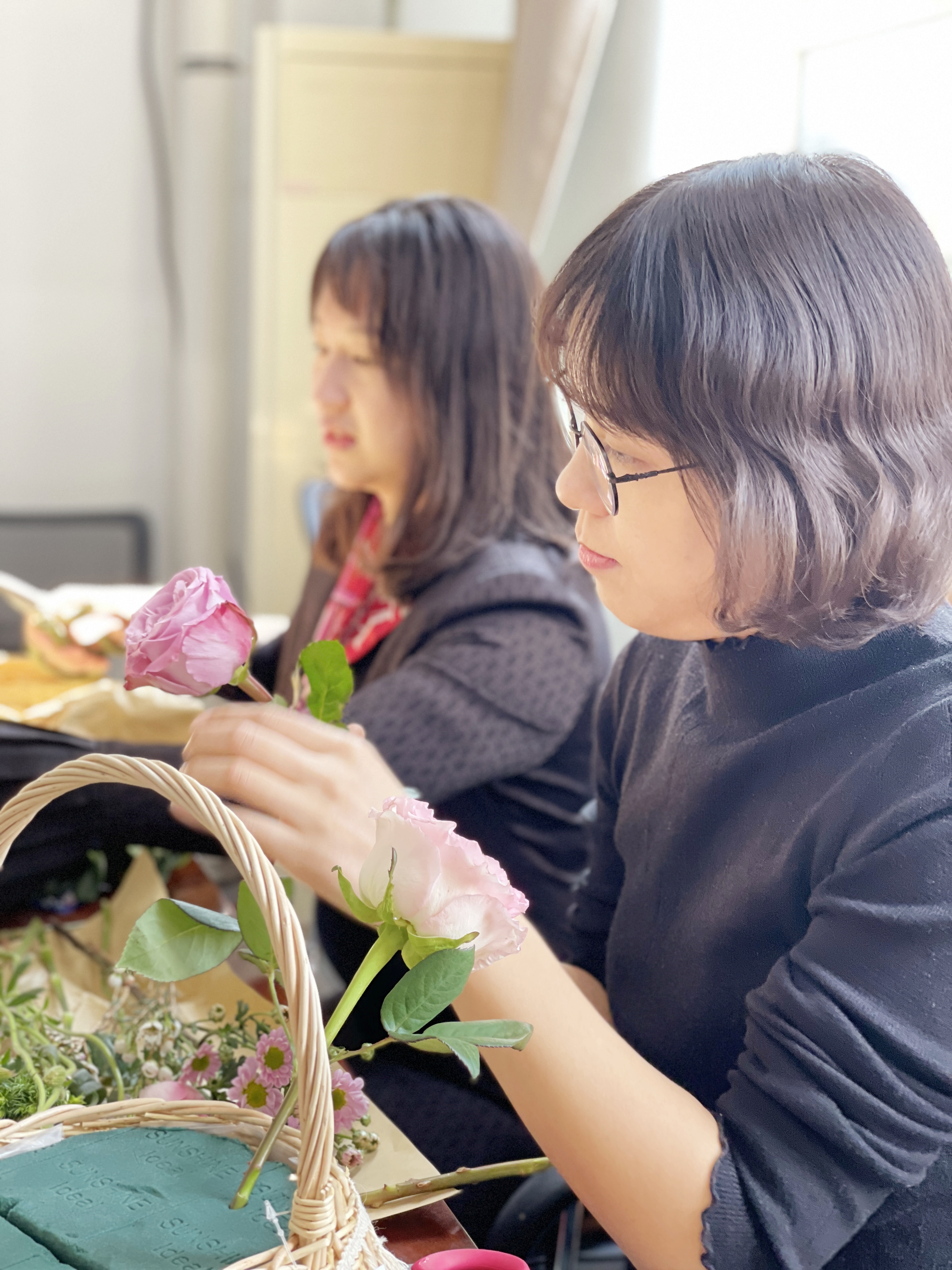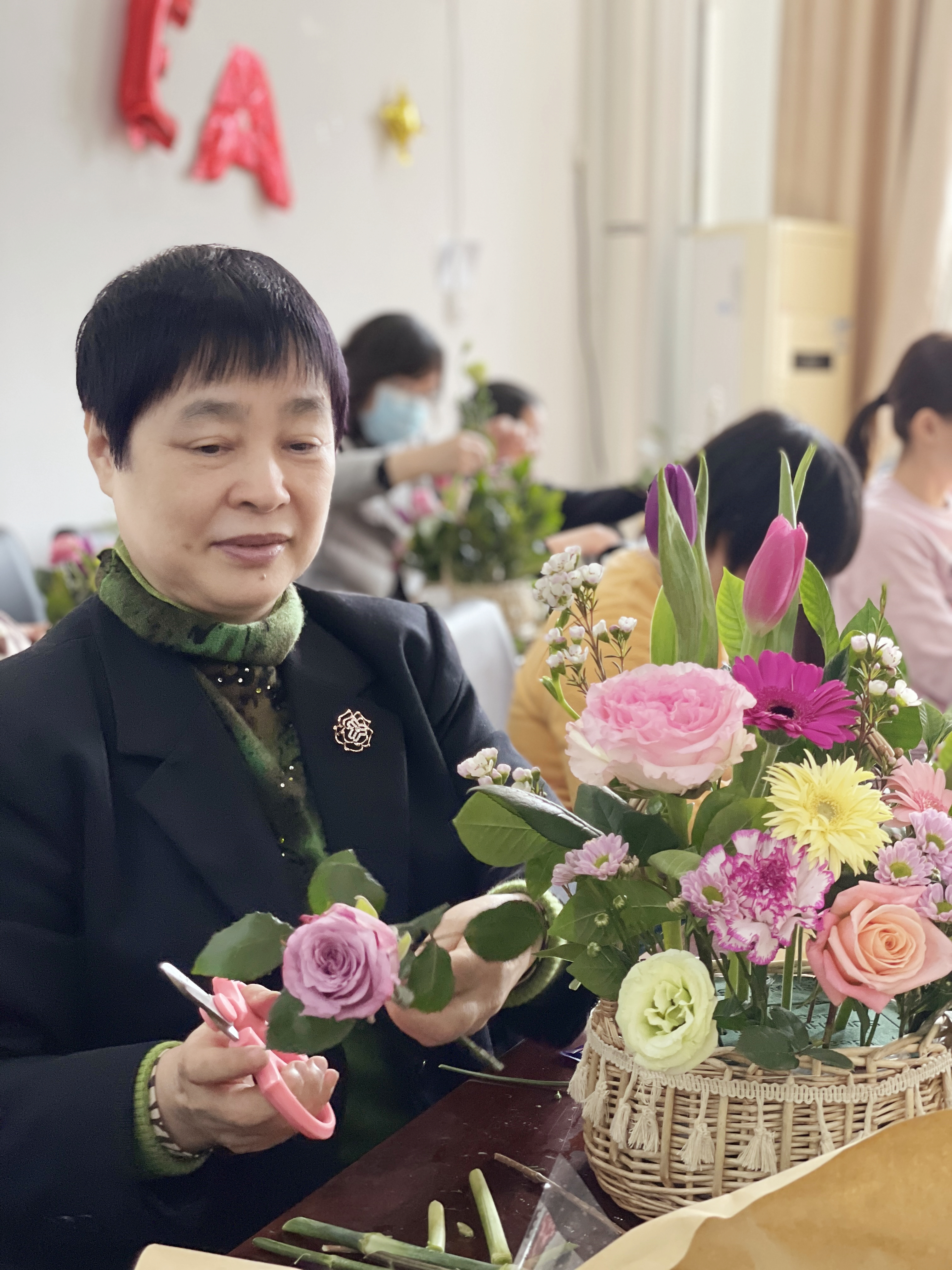 李宏伟代表学院党委对女教职工表示了节日的问候。吕军对学院的关心和支持表示感谢。艺术指导老师介绍了插花的历史、分类和基本操作顺序后,在场人员开始纷纷打造自己心中的小花园。插花过程中大家学习交流着花草的习性、生长周期等知识,对比着不同人插花的结果,春天伴随着花枝的摇动起落悄然降临。