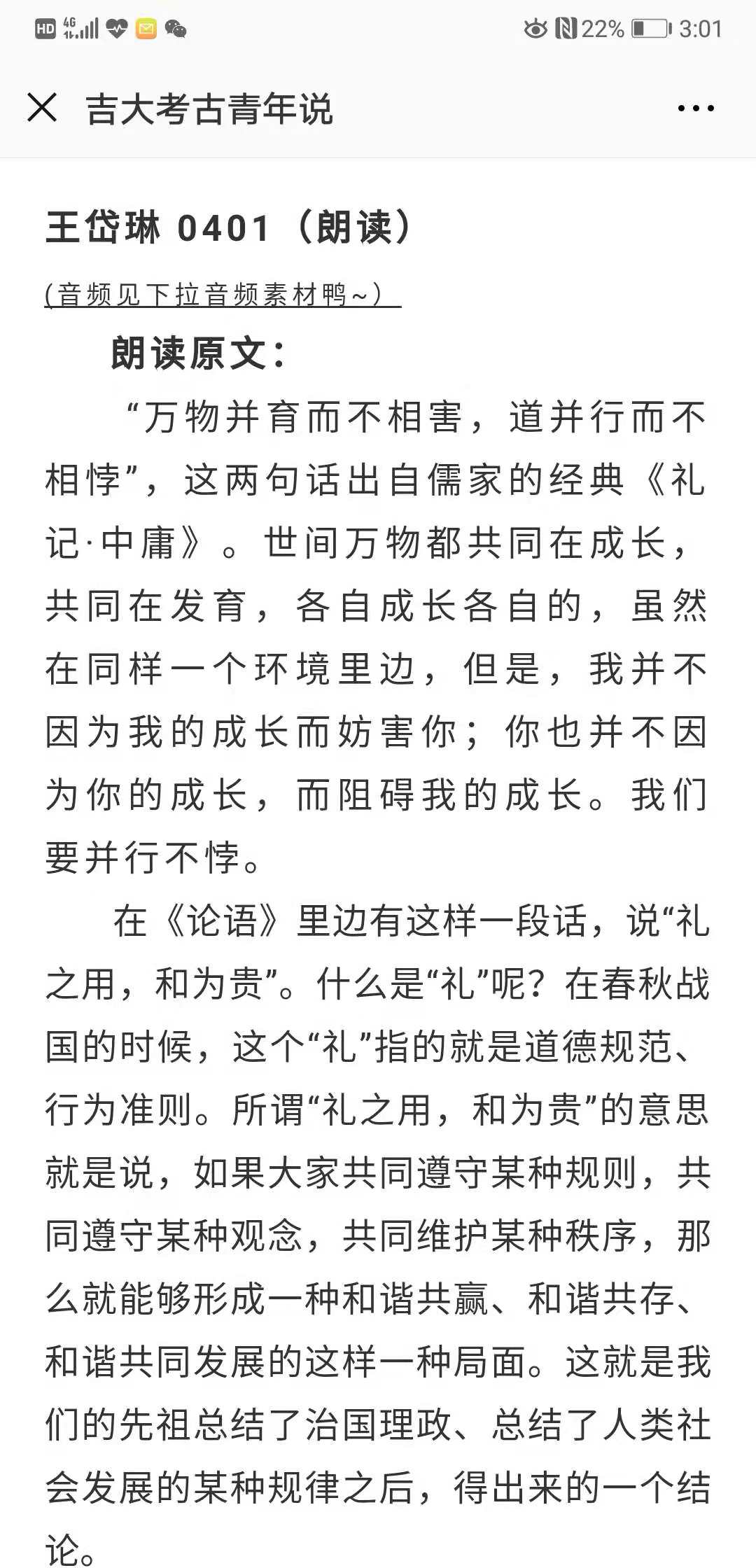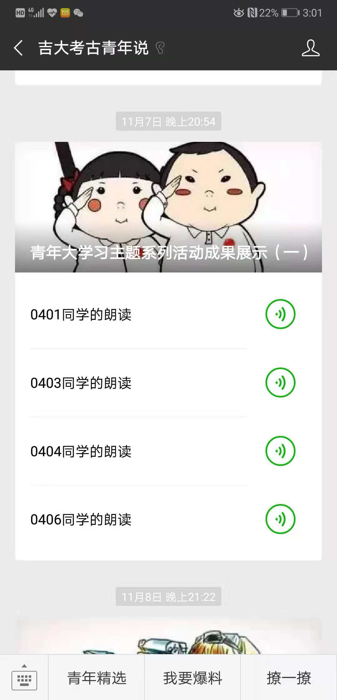 首先,本次推送中吉大考古青年说微信平台首先展示了霍奕然等四名同学的经典朗读音频。其中,我们聆听了西瓜视频 同学们阅读了习近平总书记关于构建和谐社会的讲话,也听到了董和同学阅读总书记在北京大学讲话中的15个“金句”的音频,读懂了习近平总书记对青年的教诲,激发了西瓜视频 同学们的学习热情。
