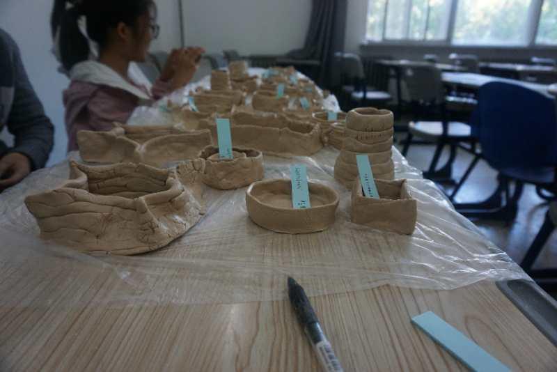 在师兄的分享结束之后,制陶活动正式开始。由工作人员将事先分装好的陶泥发放到每一个同学的手中,然后大家便开始了对自己手中这块陶泥的创作。与此同时 在场的工作人员也开始了指导与帮助,而且也会抽空自己动手创作一个作品。陶泥刚拿到手里,同学们都是毫无头绪,对着面前这个像面团一样的东西束手无策。不过经过大家一次次的尝试,大家也逐渐进入了状态,手中的陶泥也逐渐有了形状。慢慢的,一个又一个精彩的作品出现在了大家的桌上,引来其他人一阵阵的围观惊叹。渐渐地,教室后侧的课桌上已经摆满了大家各式各样的作品。在作品上放好标签后,同学们便满怀着成就感离开了活动教室。