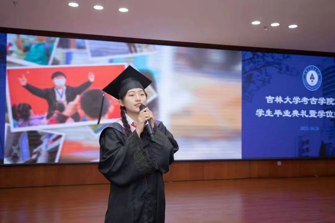 赵宾福院长回顾了过去四年学院工作中取得的一系列成果,结合自身感悟,在致辞中向同学们提出三点殷切期望:第一,要永葆一颗“公而忘私”的爱国之心,甘于奉献,勇于担当。第二,要坚守一颗进取之心,保持独立的思考和判断。第三,要修炼一颗豁达之心,热爱生活,达观处事。赵宾福院长勉励全体毕业生要在日后继续发扬吉大考古人的治学精神、探索精神和奉献精神,主动肩负起“讲好中国故事”的使命担当,以为专业知识素养为舟楫,开拓未来、奉献社会,为中华民族伟大复兴做出应有的贡献。