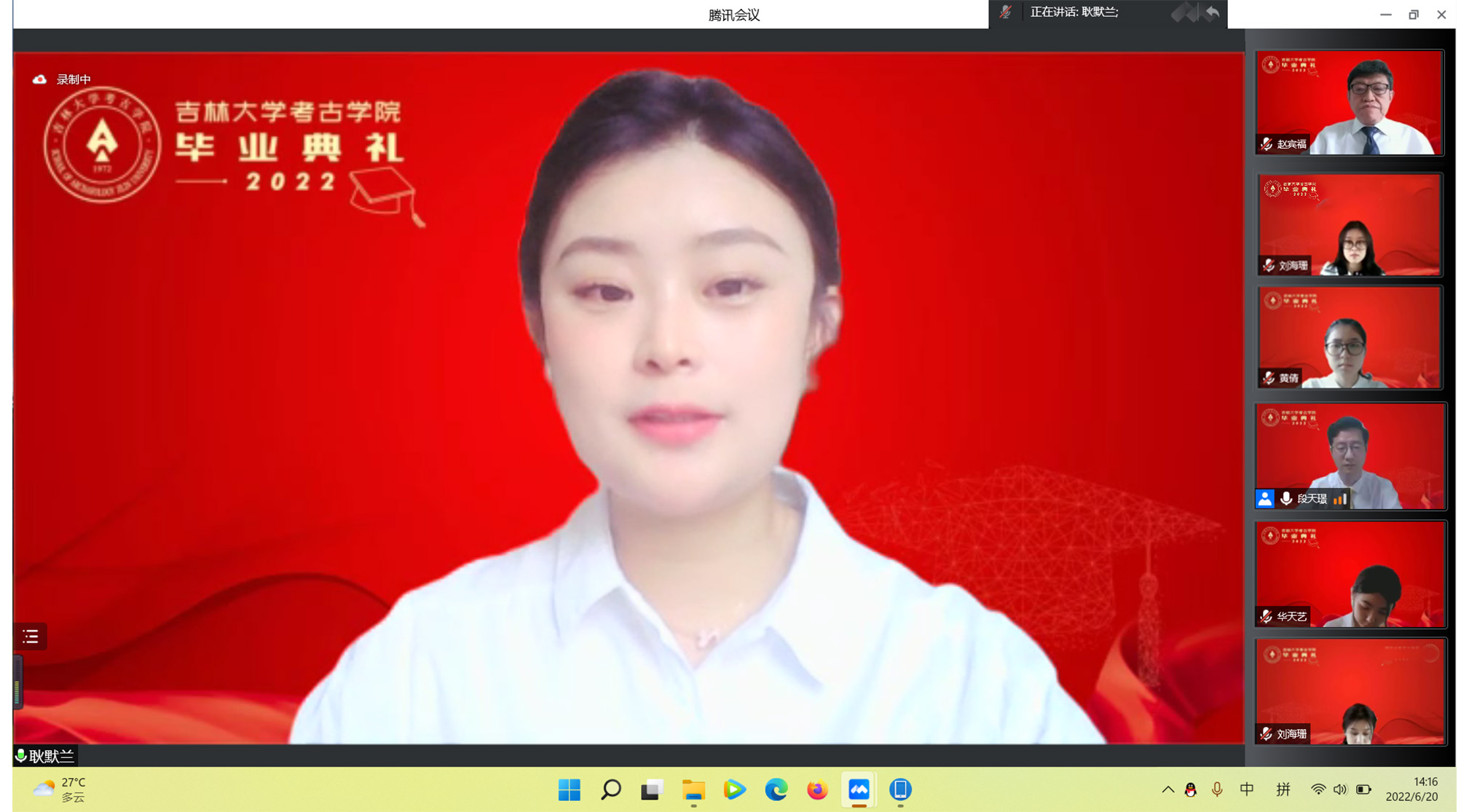 本科毕业生代表、2018级文物与博物馆学专业耿默兰同学,硕士毕业生代表、2019级考古学专业李萌同学,博士毕业生代表、2019级考古学专业彭博同学代表全体毕业生发言。他们追忆了在吉大考古的点滴故事,用“充实”“承扬”“感动”三个词语表达了对求学时光的感悟。他们表示,在吉大和同学们一同跨过了中国考古百年,仰视先贤,聆听传奇,所学所得皆仰赖于百年来考古人接续奋斗之所得,生逢盛世、肩负重任的考古学子应当激发信仰、克服困难,以青春之我谱写事业的新章。