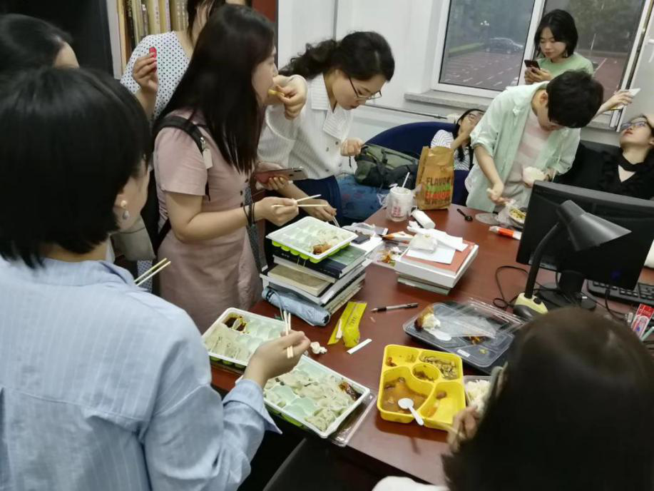 论文答辩从下午1点持续到晚上8点,由于时间紧张,在答辩间隙,来不及出楼吃晚餐的同学们一起聚集在冯楠老师的办公室,分享着晚餐,尚未答辩的同学则准备着自己的陈述词,猜测着老师可能会问的问题,小小的办公室里一片和乐融融。