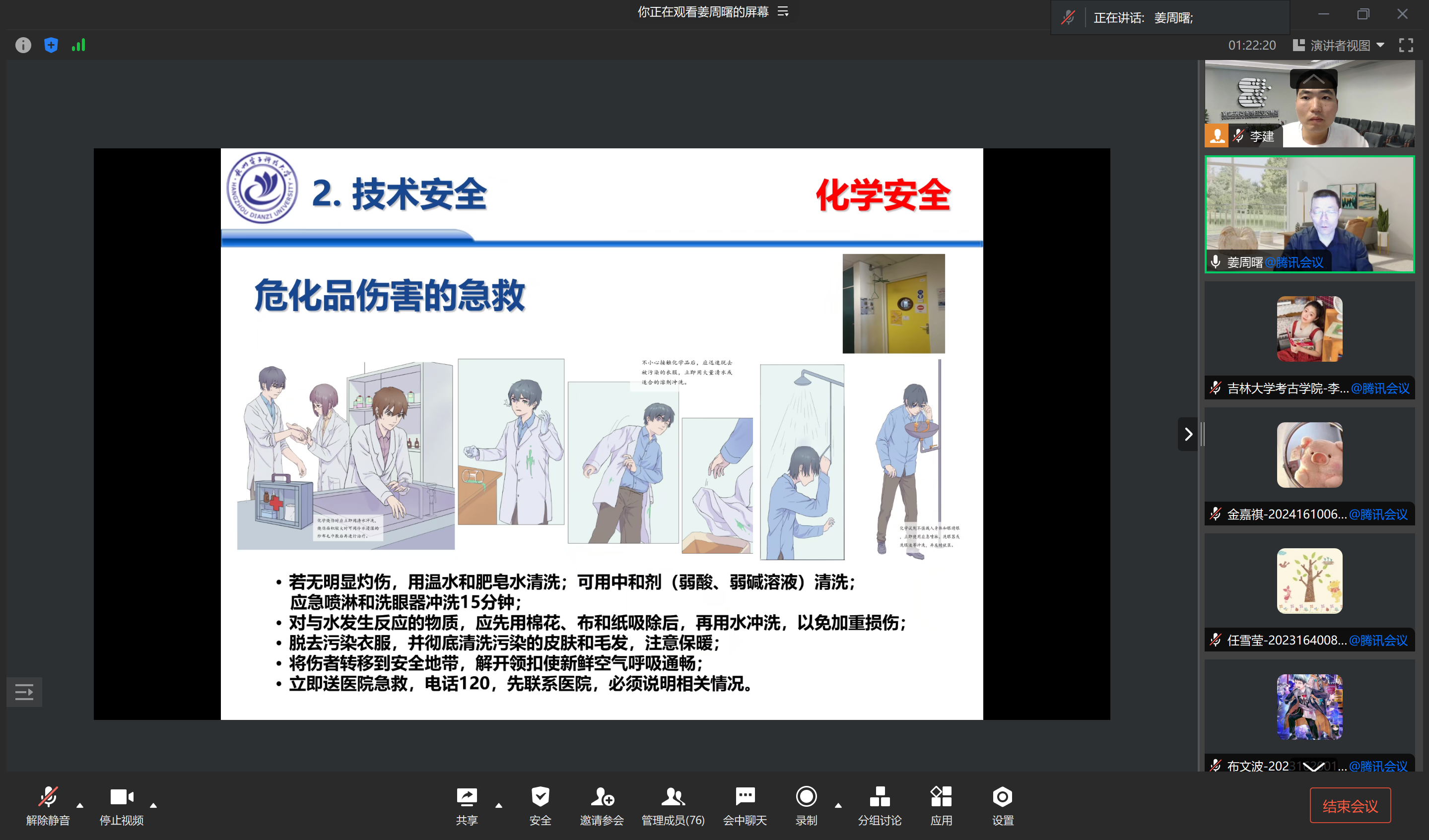 、生命科学学院师生参加。会议中,姜周老师利用漫画和图片,结合高校实验室安全事故案例,详细讲解了实验室安全要点,包括安全准入、危险源辨识、风险评估、个人防护及操作规程等方面的安全知识。他特别强调了化学品安全使用与存储的重要性,并展示了氢氟酸泄露事故的应急处理流程。同时,他还介绍了安全色和安全标识的分级分类使用原则。与会师生表示,本次讲座内容形象易懂,案例贴近真实实验场景,学习后对实验室安全有了更加全面、深入的认识。