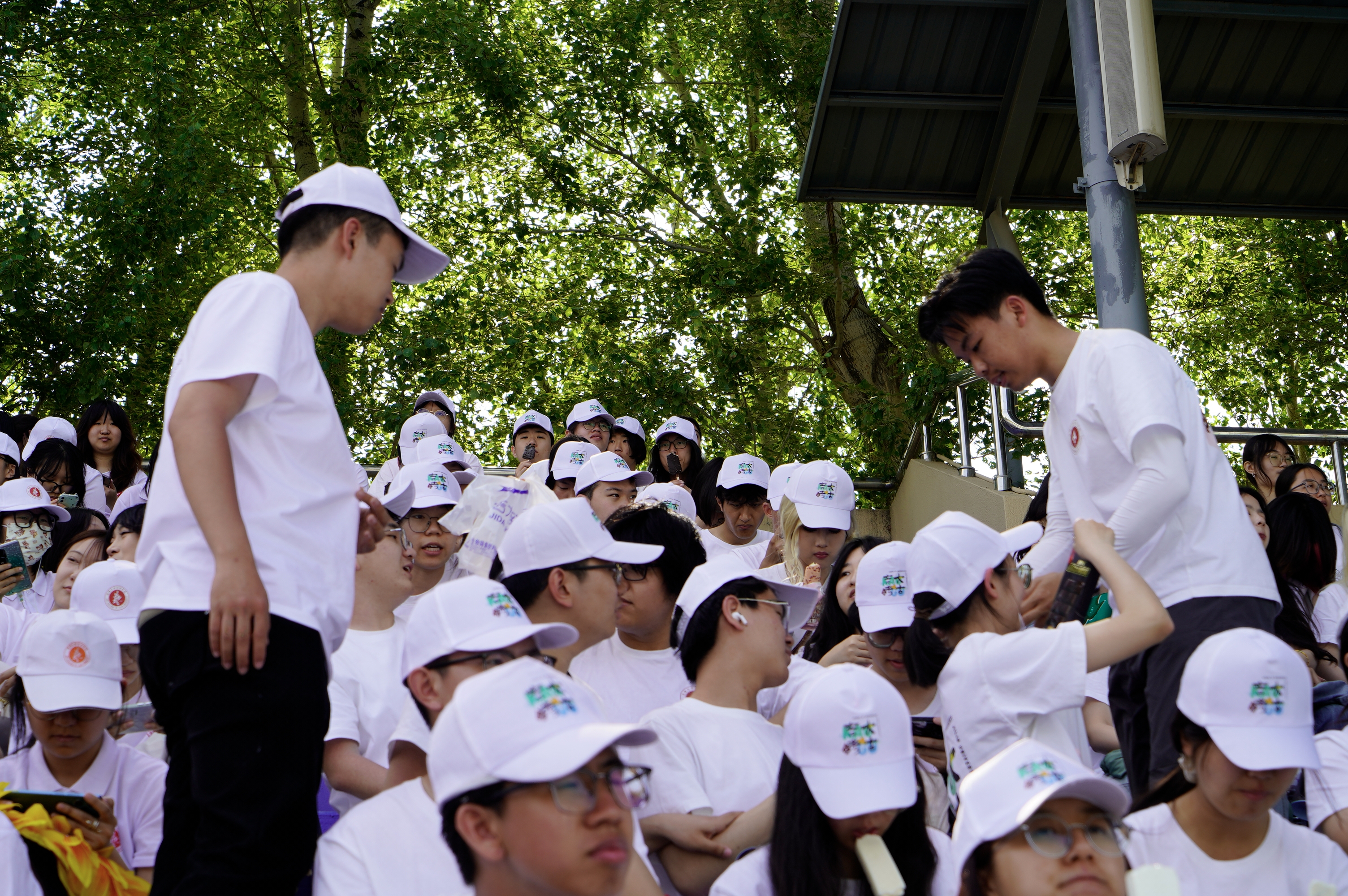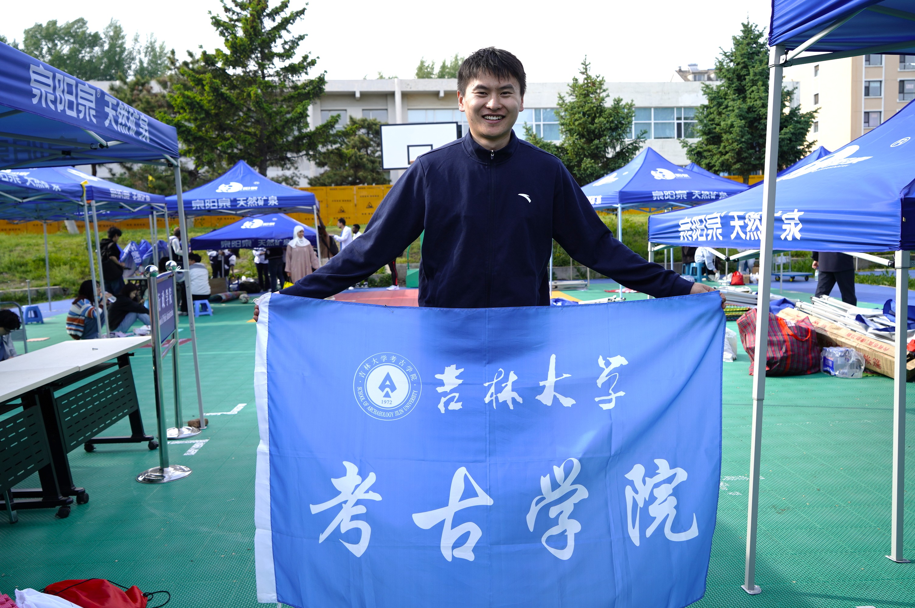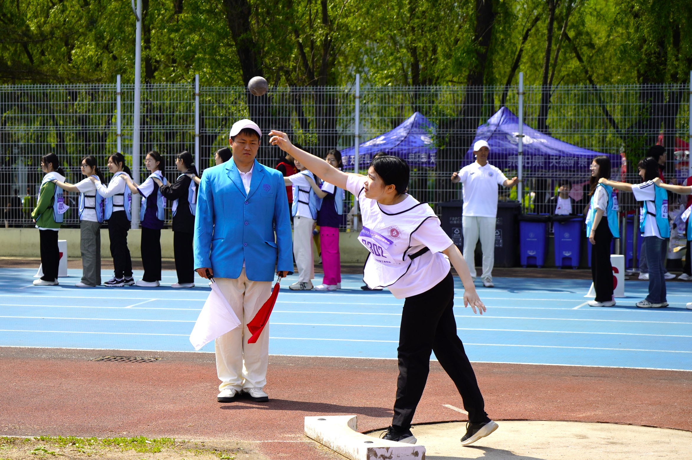 竞技场上迸发着考古学院师生的热血。唐诗雨双线突进学生组女子100米与200米最终对决,刘荟在学生组女子铅球项目掷出决赛通行证,依德日贡老师更斩获教职工组男子跳高与跳远双项冠军。看台区五十余把红伞次第绽开,随着牛皮鼓的隆隆节奏翻涌成赤色浪涛,“追本溯源,展史明瑰”的呐喊声震彻云霄,助威化作醒目的文化标识。