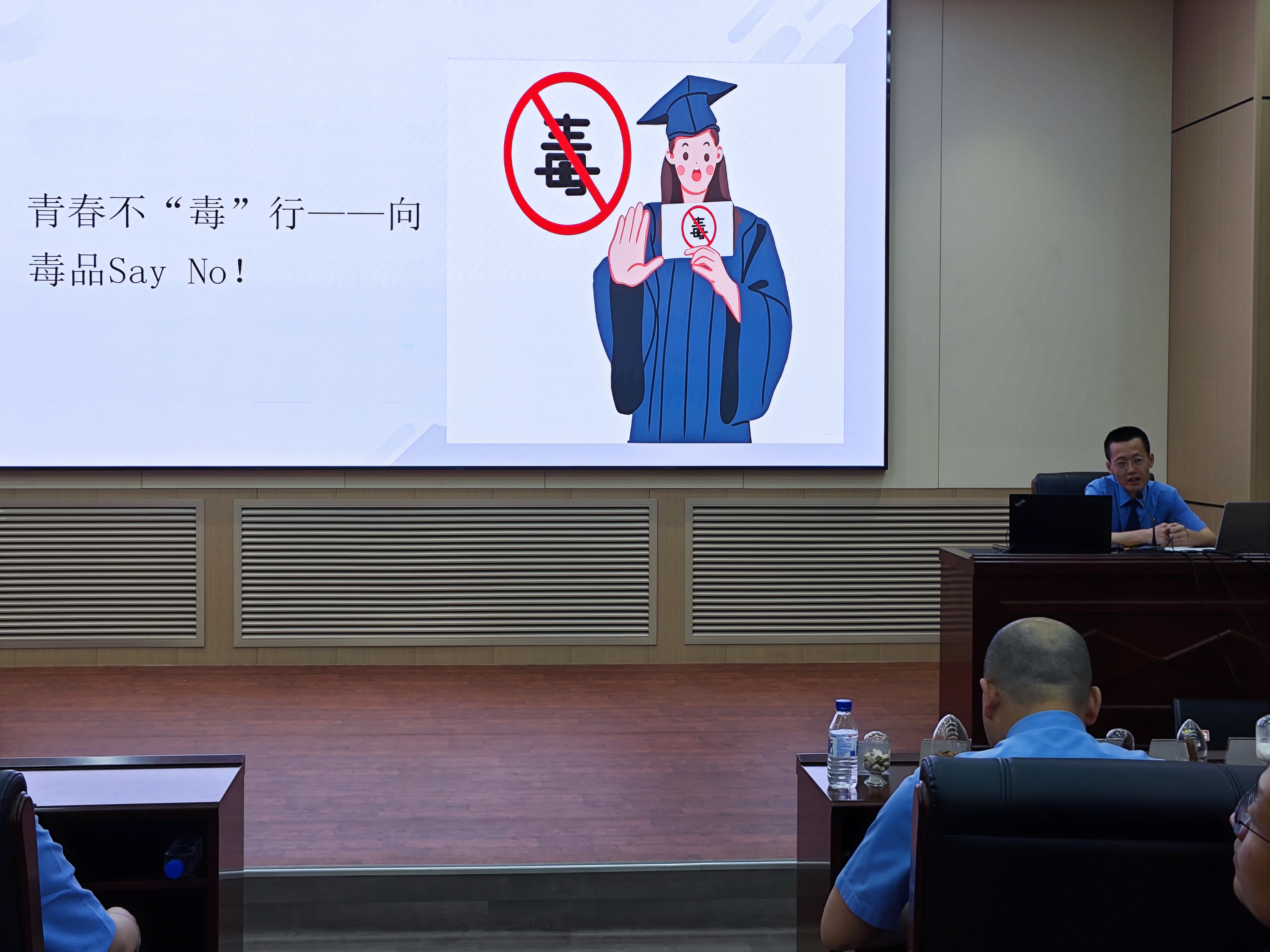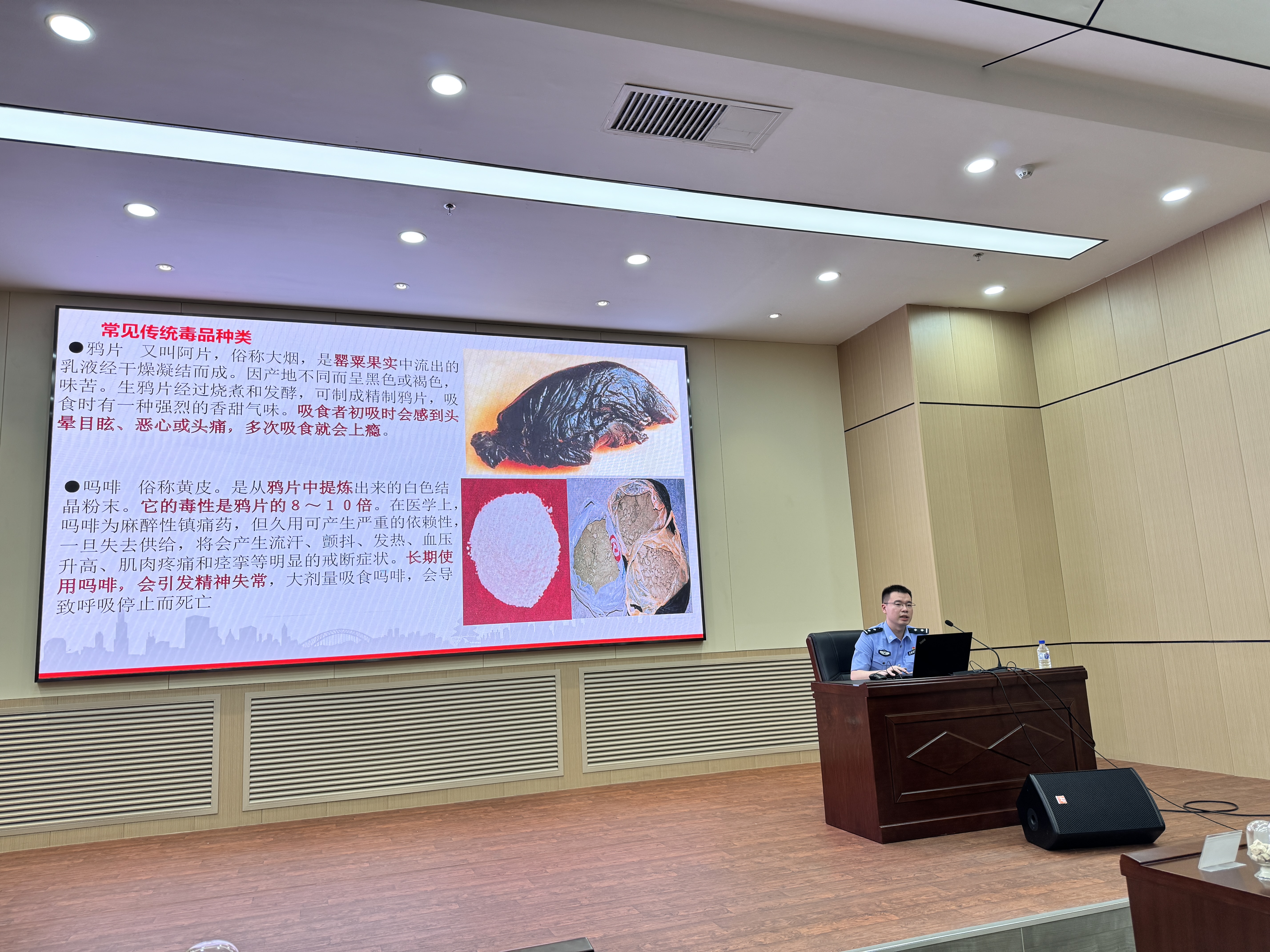 讲座首先邀请长春市人民检察院第二检察部姜云峰检察官做《青春不“毒”行——检察官带你筑牢禁毒防线》主题讲座,邀请长春海关缉私局侦查处姜榆警官做毒品预防宣传教育讲座,两个讲座围绕毒品种类、性状、致病机理,吸毒原因、危害、量刑,如何拒绝毒品等几个方面让大家学会识毒、认毒、拒毒。讲座过后,师生现场观摩了20种常见毒品,加深了对毒品的认识。