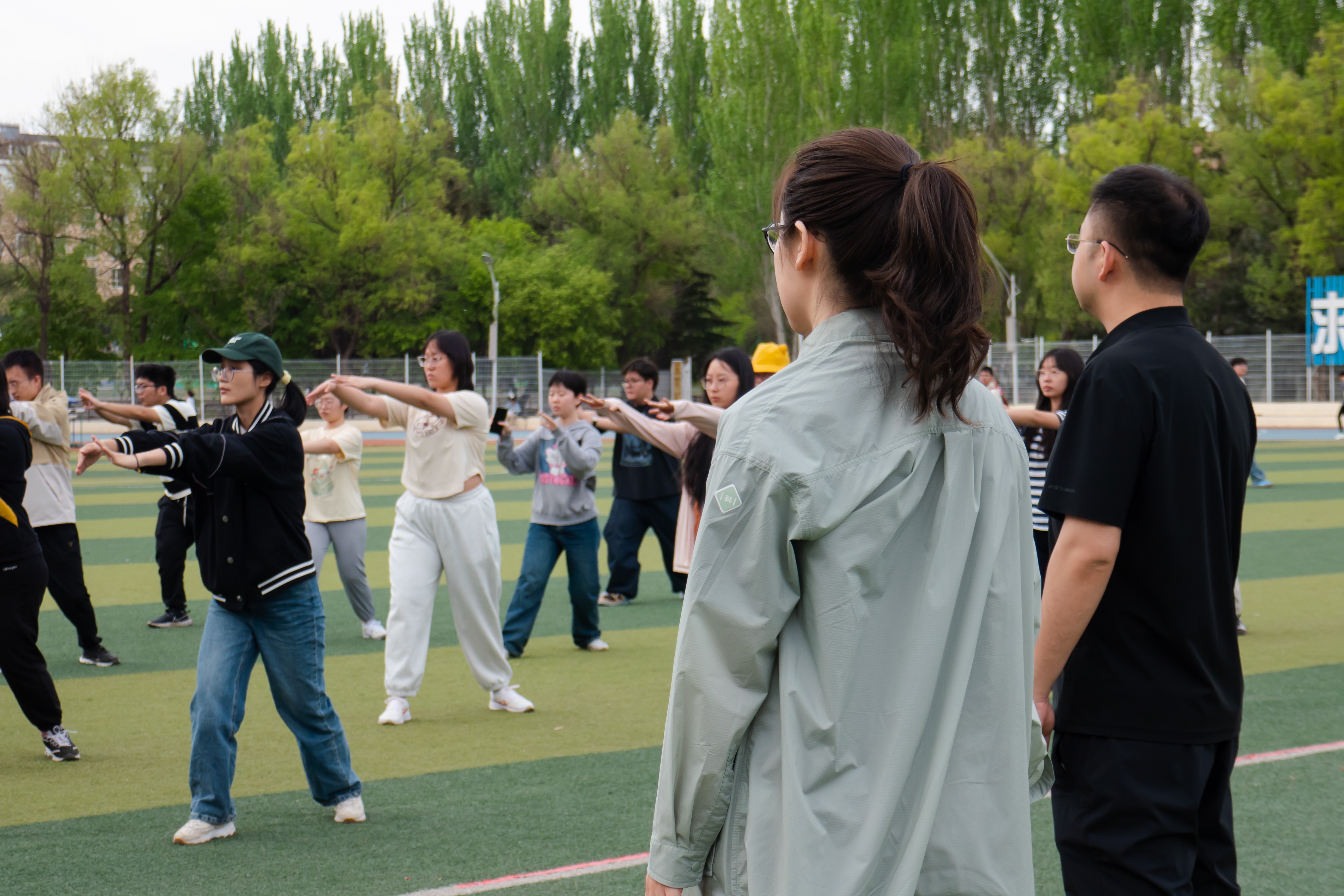 5月9日,院党委副书记侯建峰老师,辅导员马嘉男、邱泽涵老师前往训练场地,陪伴并跟进同学们的训练。老师们对太极训练成果称赞有加,并鼓励同学们相互学习,团结协作,精益求精。