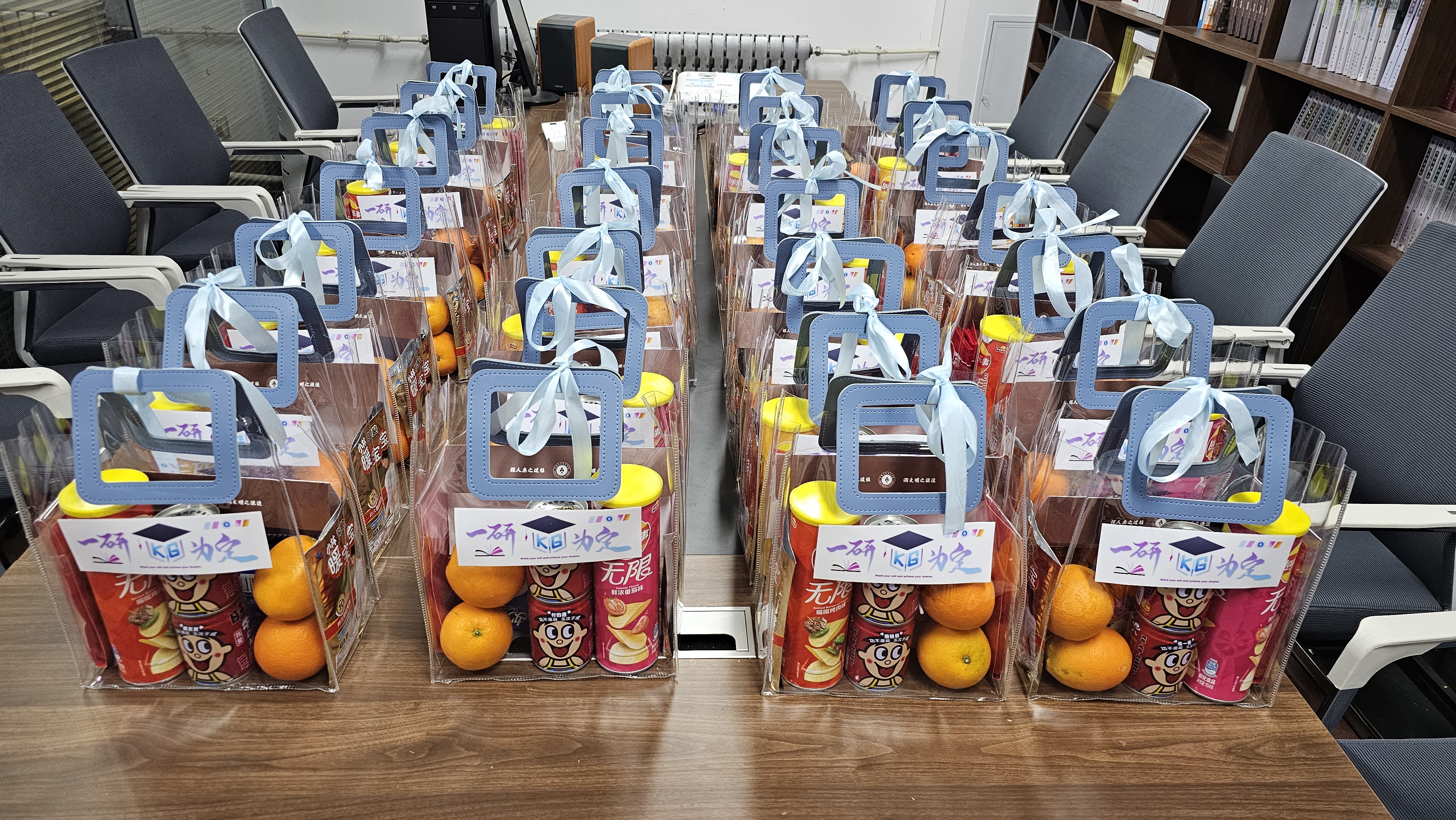 考研福袋中的每样物品都是精心准备的,承载着学院对学子们的浓浓关爱和深深祝福。包含老师亲笔书写的明信片,“一战成硕”考试专用袋,定制“牛”气冲天、一“旺”到底的旺仔牛奶,给“足”力量的上岸红袜,温暖备战的御寒暖贴、“棒”上有名的棒棒糖、“乐事”无限的薯片、心想事“橙”的橙子、“妙”笔生花的妙芙蛋糕。