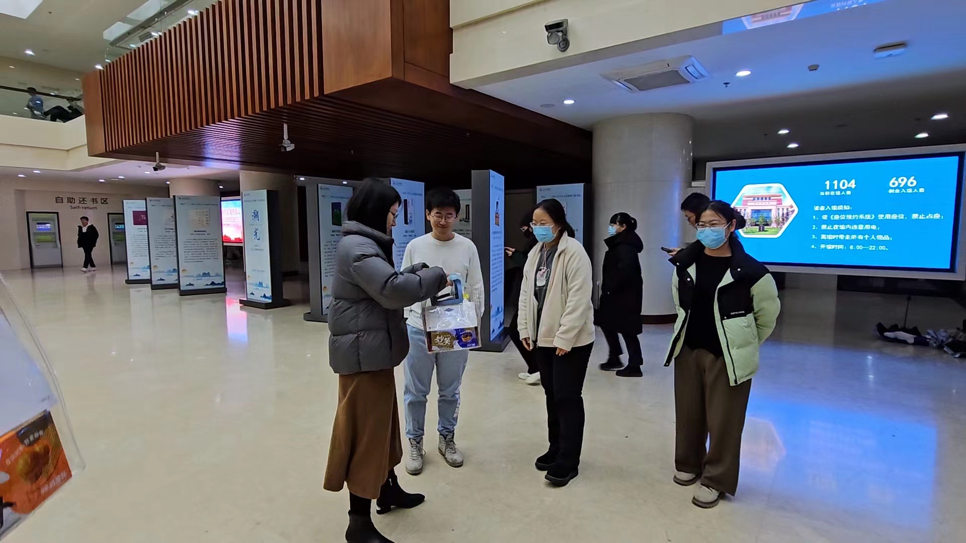 辅导员马嘉男老师带领研究生团委副书记王克豪和辅导员助理高洁,分别前往图书馆、教学楼和学生宿舍,将考研福袋送到同学们的手中。期间,辅导员老师鼓励同学们在最后冲刺阶段要充满信心与勇气,保持良好心态,克服困难,坚持到底,全力以赴迎接考试。