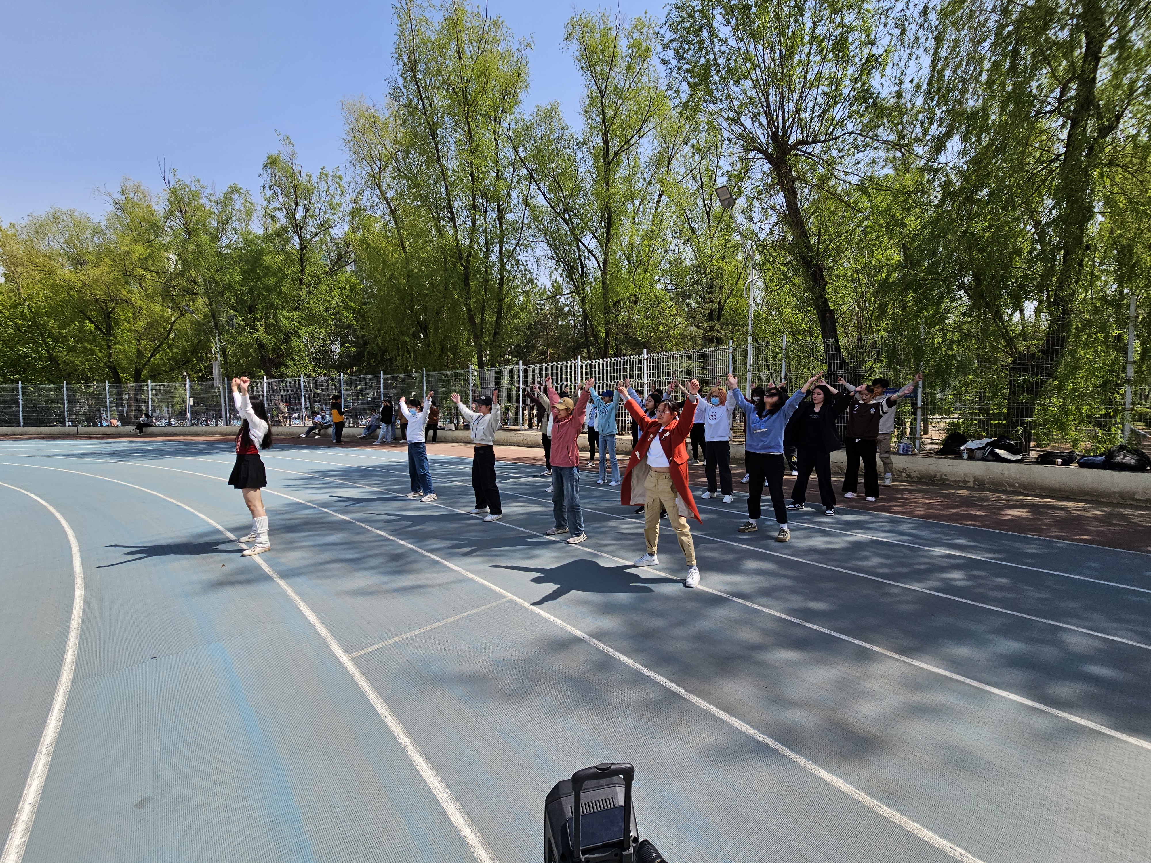 在田径场、排球场和中心体育馆先后组织了学院啦啦操方队集体训练。由李肇萌、方静怡、景致同学担任领队,共有20名同学参加训练。学院团委负责人马嘉男老师、本科生辅导员邱泽涵老师和研究生辅导员郑凡一老师多次前往训练场地了解同学们的训练情况,为大家打气助威。