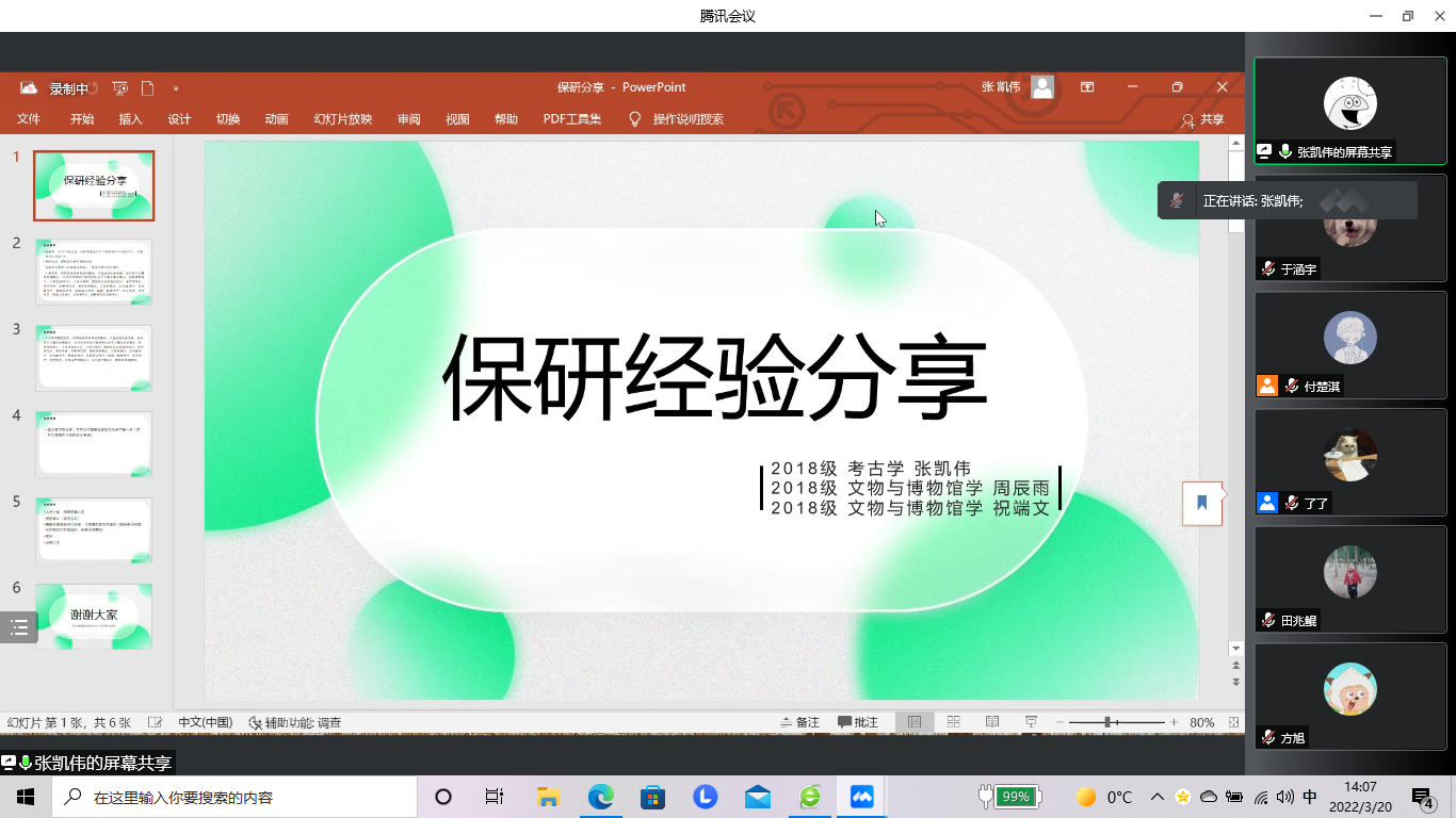 科研学术部举办了“研”途有你,薪火相传——保研专场“云”分享会。会议由付楚琪同学主持,邀请了已经成功保研的2018级考古学专业张凯伟、孙嘉茹、王英萍、田兆鲲,文博专业的祝瑞文、周辰雨同学进行分享,六位同学结合自己的保研经历,分别就相关院校的保研政策、申报流程、面试经验等方面的内容进行了交流。