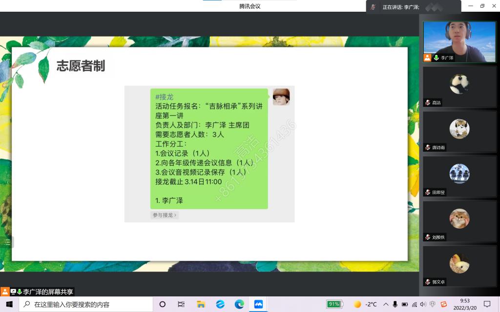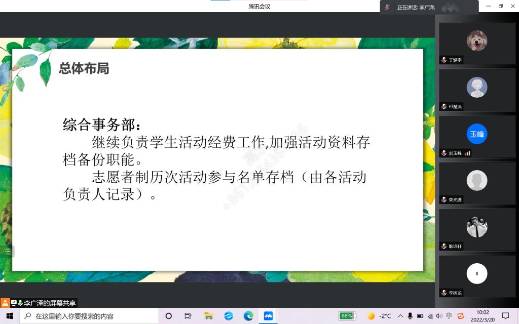 接着,从学生会主席团开始,各部门负责人纷纷对新学期部门工作的总体布局加以介绍与展望,并表示尽快制定适应当今疫情严峻形势下的各项活动方案,积极将线下工作转向线上,为同学们打造更多优质服务与活动。最后,李广泽清晰展望了未来学生会的发展方向,他希望学生会全体成员能够明确发展现状,积极探索和学习,加强改革创新,丰富学术探讨,打造西瓜视频