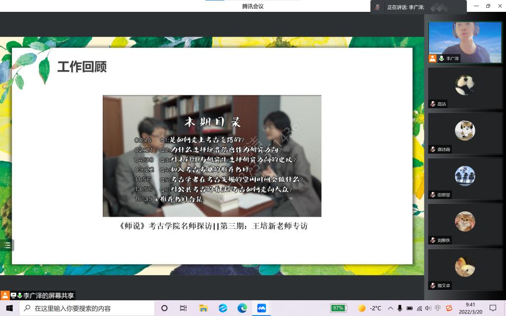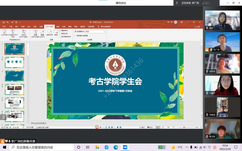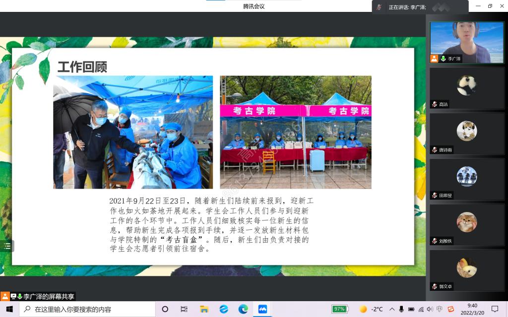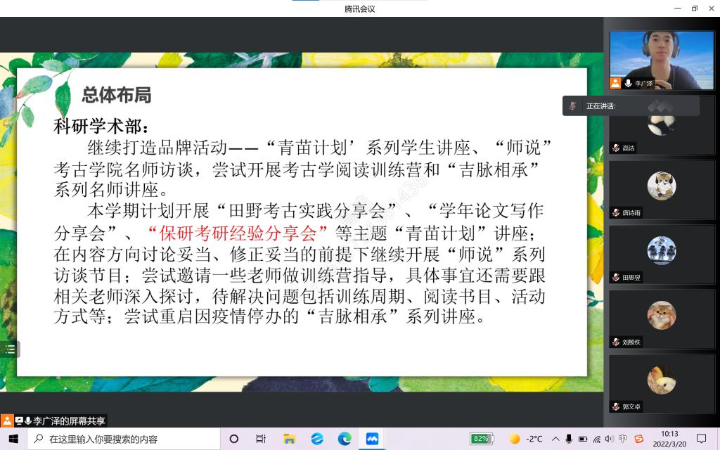 会议共有三项议程,即工作回顾、总体布局以及讨论答疑。会议伊始,李广泽首先总结汇报了学生会过去一学期的主要工作成果。上学期,各部门齐心协力策划并成功开展了若干活动,如百年考古百年党定向越野特别纪念活动、“青苗计划”系列活动、“我与吉大一百天”作品征集活动等,广受师生好评。同时,也对工作中出现的创新不足、特色不明等问题进行了反思,提出了立足专业基础,开展西瓜视频