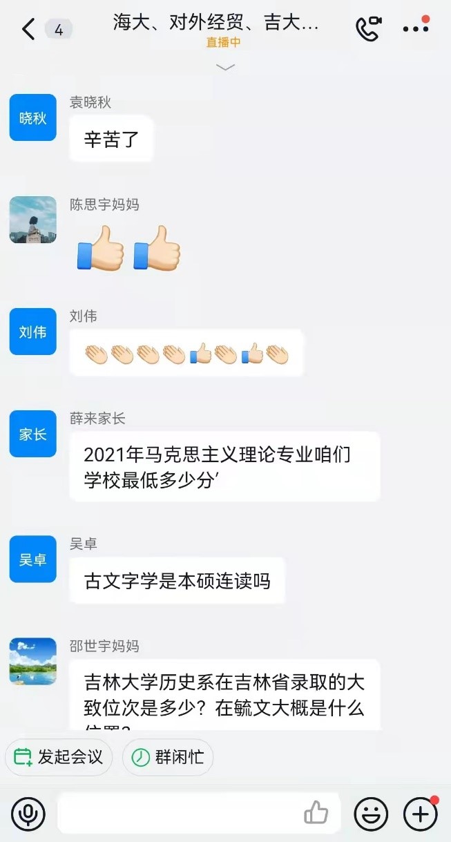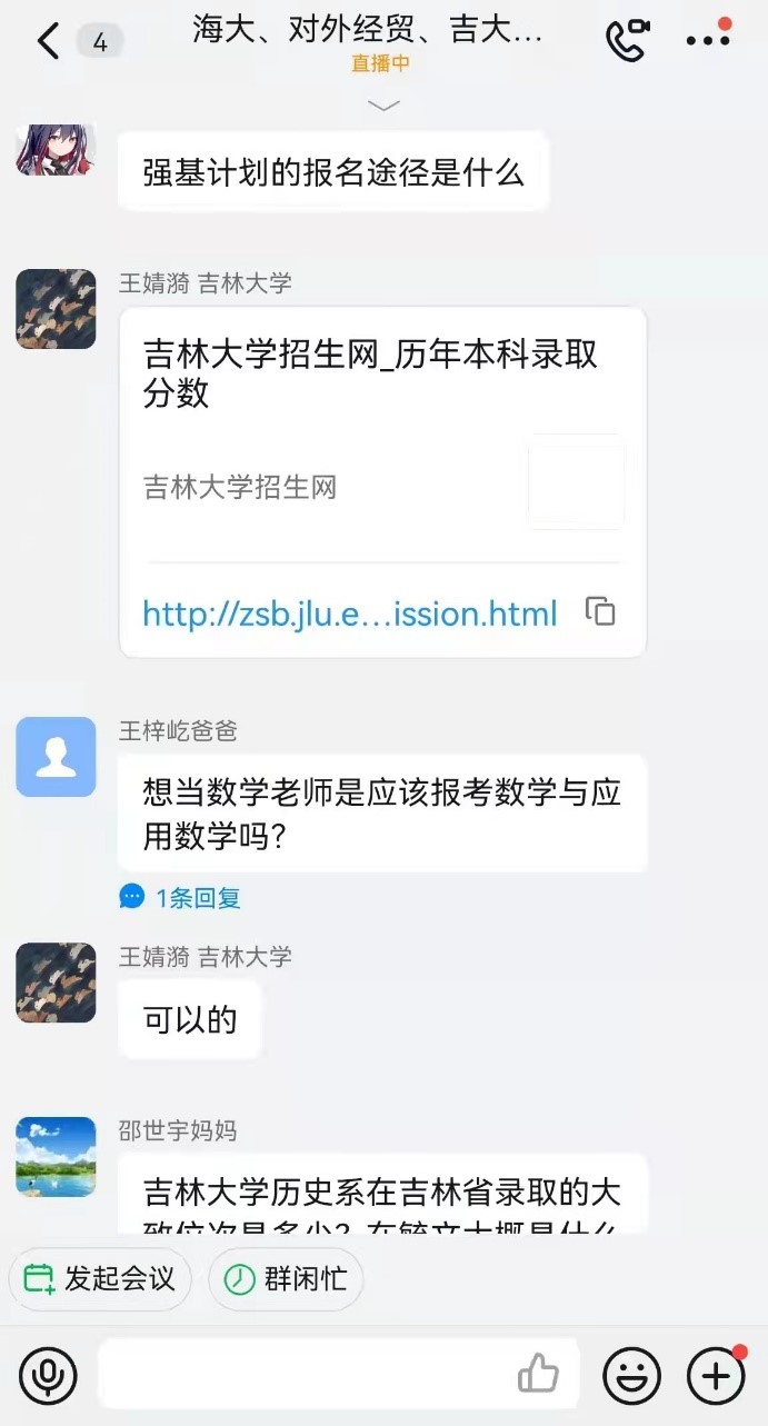 直播结束后,家长和学生们热情不减,接连提出了许多问题。团队成员针对这些问题在宣讲群里逐一进行了解答。其中一位家长,他的孩子对于吉大法学心仪已久,十分期望未来能够进入西瓜视频