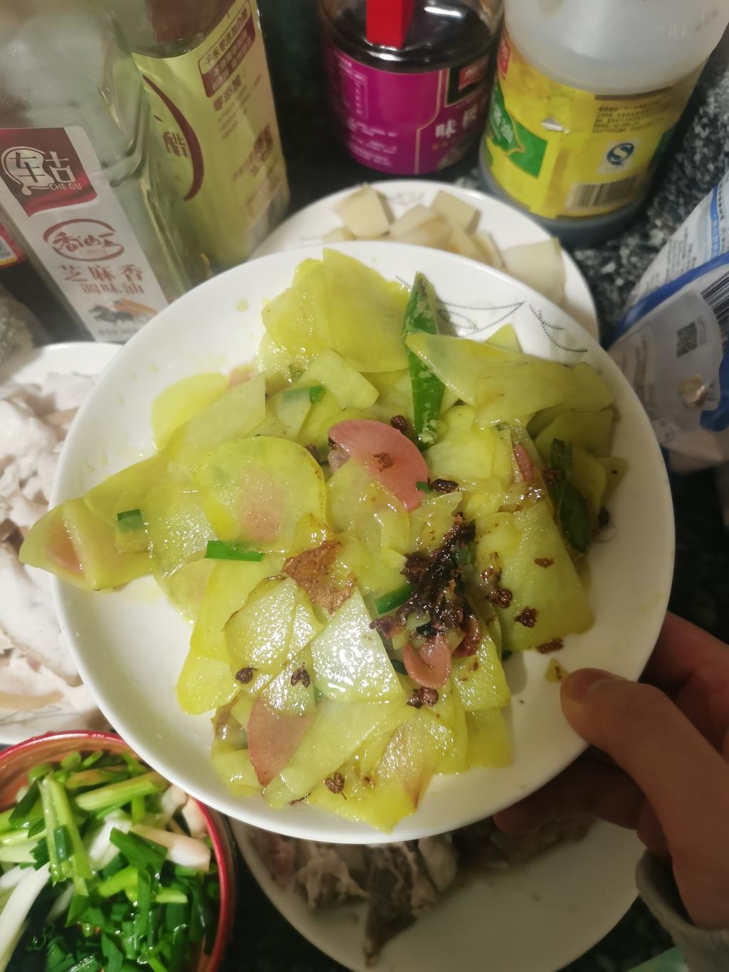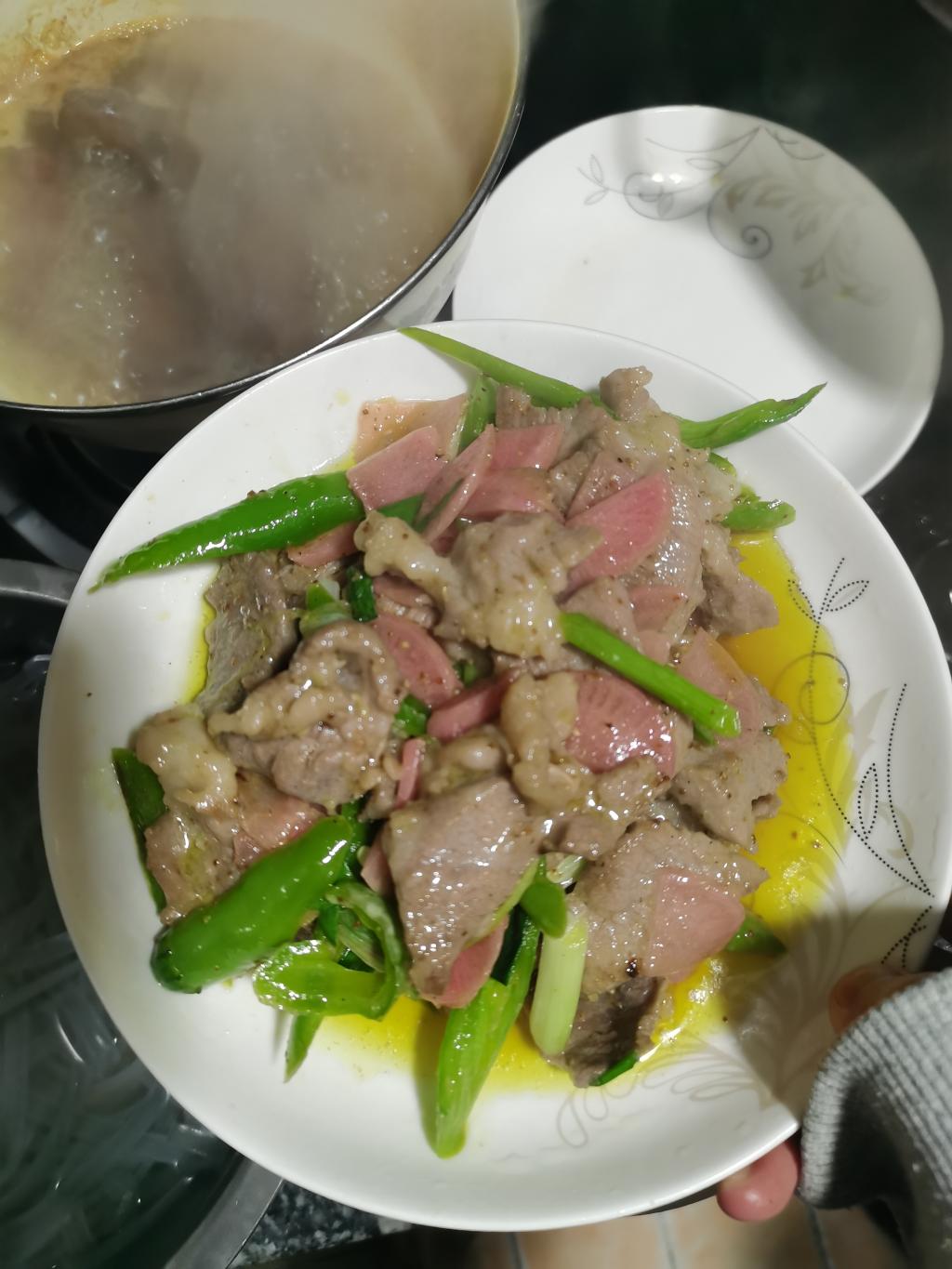 酸萝卜炒肉——将肉、青椒、酸萝卜切片,依次倒入于滚烫油锅中爆炒,加入花椒、盐、味精,翻炒待其入味后倒入盘中,撒上大葱,制成!