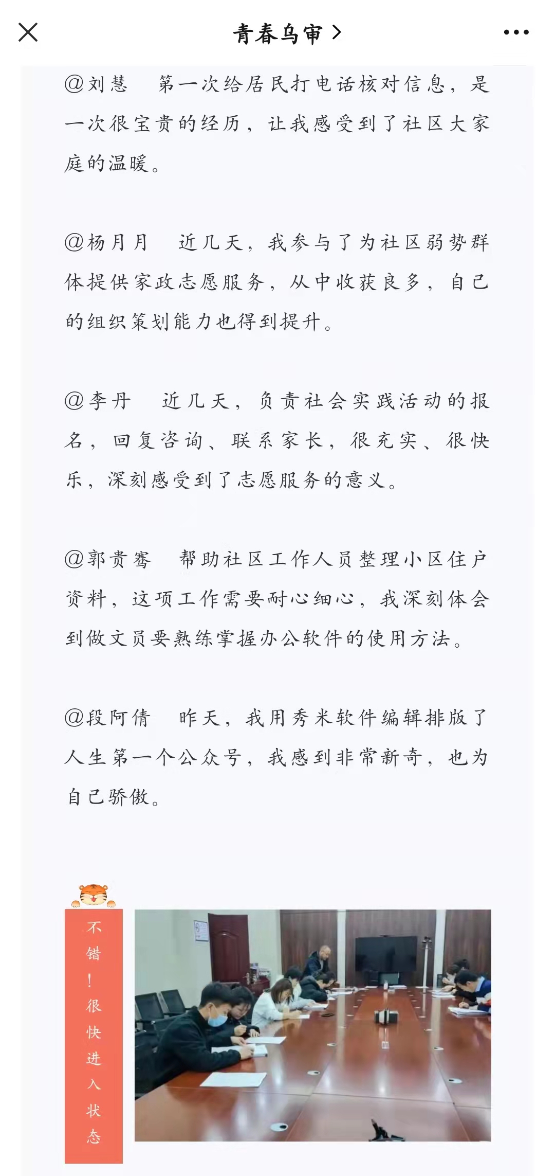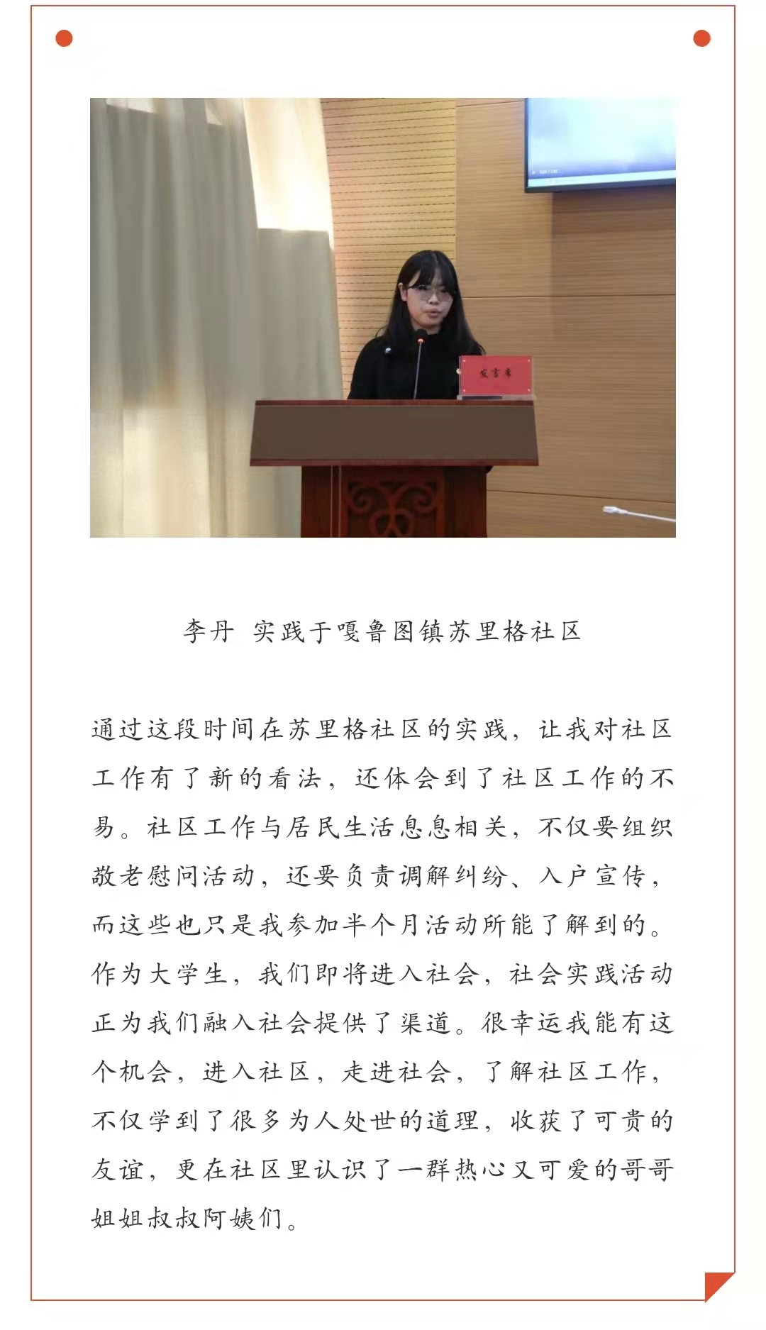 社会实践是大学生走向社会、体验社会、感受社会的一项富有意义的实践活动,在这次寒假“返家乡”社会实践活动中,李丹同学在内蒙古鄂尔多斯乌审旗嘎鲁图镇苏里格社区进行了社会实践,参与到社区的日常管理和服务工作中,不仅丰富了寒假生活,还提高了人生阅历。