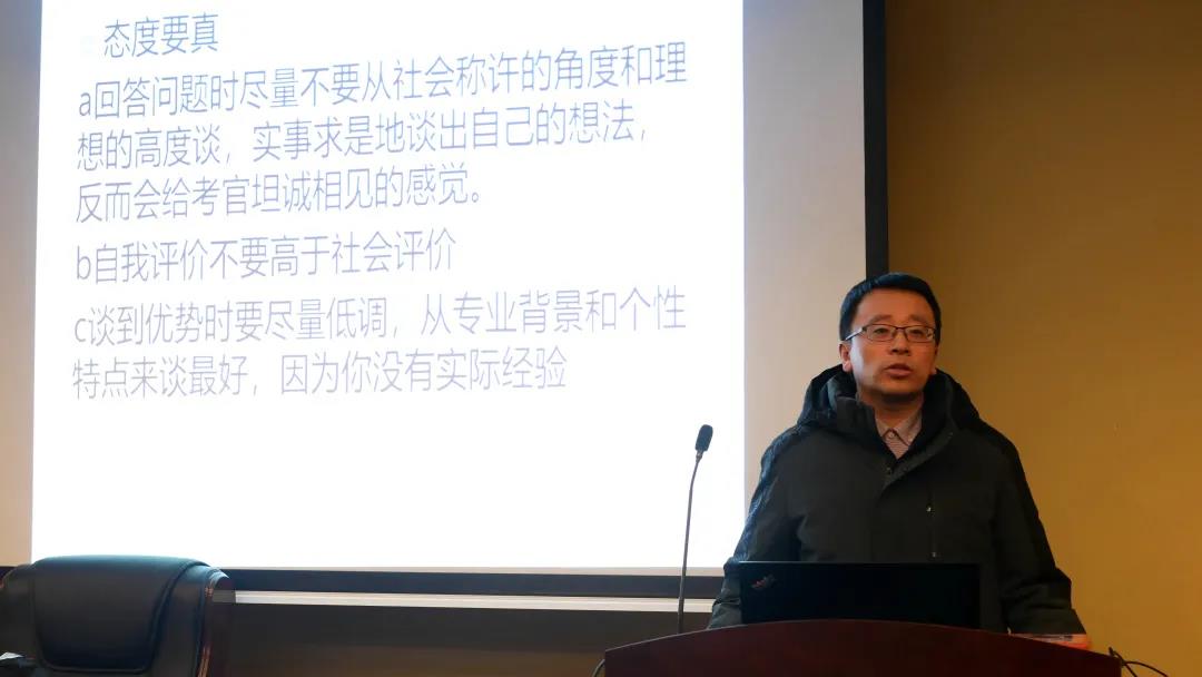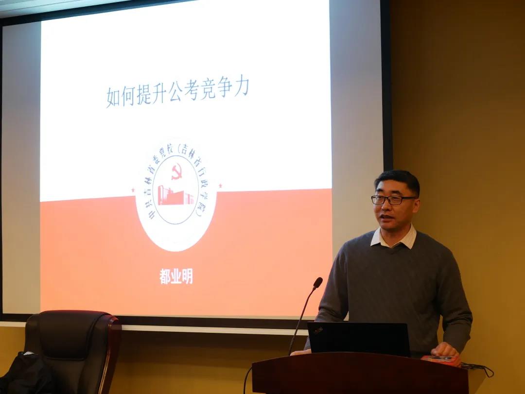 讲座上,都业明副教授从公考前需要思考的几个问题、公考考察能力要素以及如何提高公考竞争力三个方面向同学们传授公考经验。