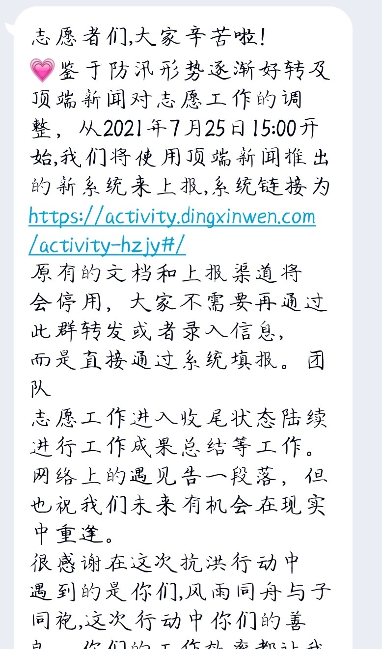 7月20日,她的家乡河南遭受了特大暴雨。灾情牵动着每一个人的心,成百上千的求助信息纷至沓来。待产的孕妇被困家中、缺乏自救能力的村镇留守老人和留守儿童孤苦无助、面临停电危机的郑大一附院有无数病人被困其中……在救援的紧要关头,不同地区的志愿者在网上迅速行动,组建线上救助团队,接收并核实各地的求助救援信息,然后将求助信息扩散给在灾区的救援者,从而提高救援效率,给被困群众带去希望。因为暴雨,灾区的信号时断时续,救援工作紧张而繁忙,各种求助信息难以及时确认是否已得到解决。志愿者们便分出一个小组,核实救助情况。他们先将各种信息汇总一起,再由志愿者通过短信、电话的方式一一寻访,最后汇总出所有的救助信息。面对着满屏的求助信息,志愿者们深感责任重大。虽然有的信息只有寥寥数行文字,但其背后却是一群人对生命的渴望。因此,即使汇总了一天的信息已疲惫不堪,她与志愿者们仍不松懈,并不断加快信息的整理速度,为的是给灾区民众带来更多的希望。志愿者们最高兴的时刻,莫过于一个个求助信息最后标上“已解决”三个字。7月25日,防汛形势逐渐好转,顶端新闻也推出新系统上报信息,员子晴参与的线上工作圆满结束。