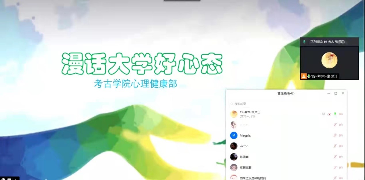 心理健康部面向2021级新生开展了“漫话大学好心态”主题云活动。本次活动的主要目的在于向广大新生宣传心理健康知识,引导和帮助新生做好学业规划,培养新生树立起自信自立、乐观向上、奋发有为的精神品格,为即将开启的大学新生活做好心理准备。活动邀请了18级考古专业田玉峰、19级考古专业温景超、19级文博专业赖琳、20级考古专业薛雯心和汤颖欣共五位发言人,分别就大学期间的学习感悟与良好心态养成等问题进行了经验分享。2021级部分新生同学参加了此次线上交流会。