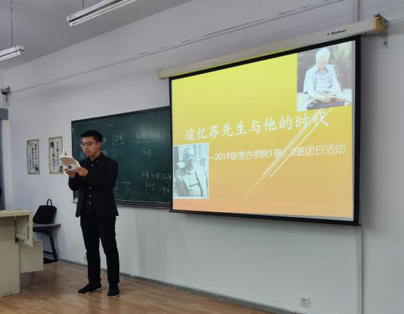 课堂上,2019级1班班长温景超同学以《追忆苏秉琦先生与他的一生》为题,围绕“苏先生的生平经历”、“苏先生的学术贡献”、“苏先生的青年寄托”三个方面进行分享。