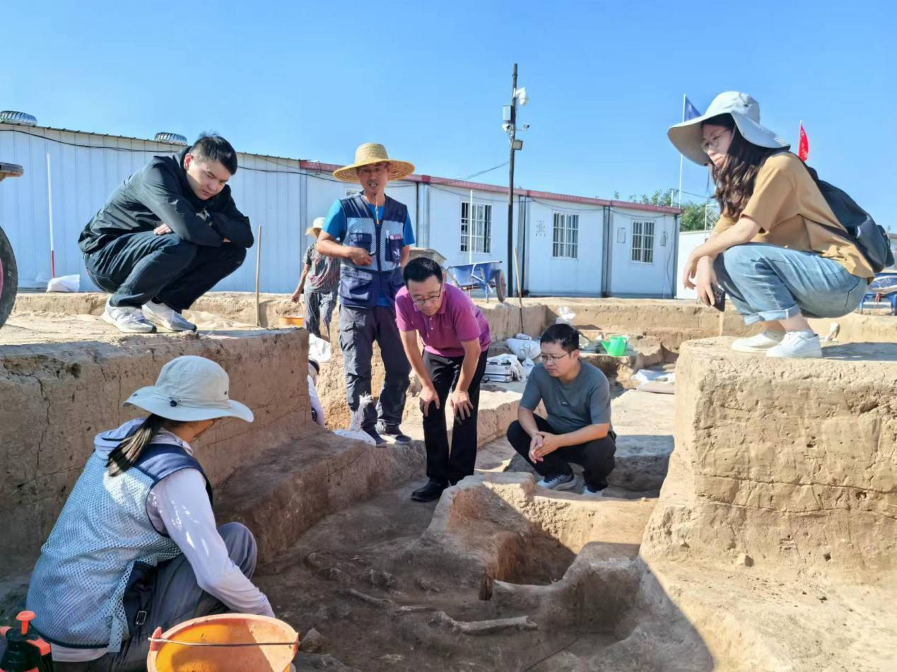 黄土卿云,条山掩映。9月17日,在基地副主任林森的引领下,学院慰问教师来到夏县辕村遗址发掘现场。林老师为大家详细介绍了2022级本科生的田野考古实习情况,并对夏县辕村遗址的发掘进度与近期收获进行了讲解。老师们走近探方,了解学生在实习过程中的收获,并为同学们送上中秋祝福。