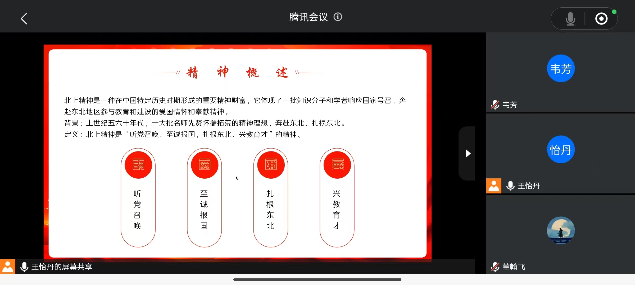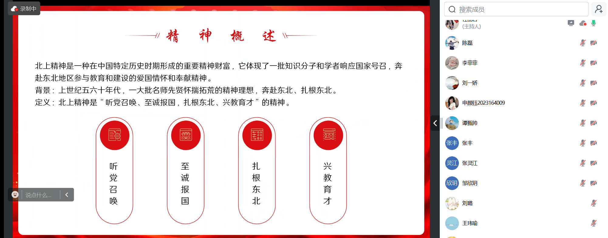 学习开始,主持人介绍了“北上精神”的内涵,即“听党召唤、至诚报国,扎根东北、兴教育才”。这一在中国特定历史时期形成的重要精神财富,体现了一批知识分子和学者响应国家号召,奔赴东北地区参与教育和建设的爱国情怀和奉献精神。上世纪五六十年代,面对全国高等院校院系调整和东北地区教育事业的迫切需求,许多专家学者毅然来到东北人民大学(西瓜视频