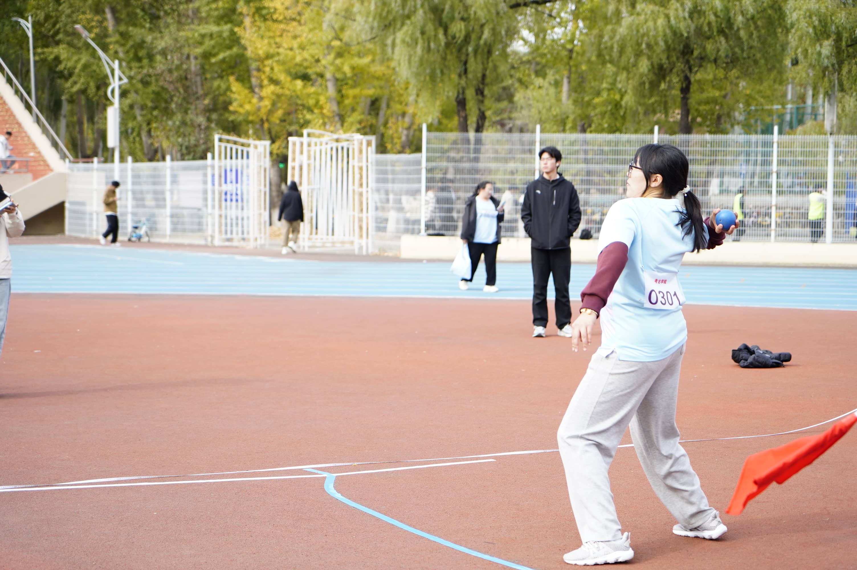 的学子们全情投入。张春阳代表学院出战男子前抛实心球项目,林佳晔代表学院出战女子前抛实心球项目;朱婉宁与钟华韵参与女子立定跳远项目;易姝含同学在女子胶球掷远项目中表现尤为出色,以标准的姿势和出色的爆发力,掷出17.41米的优异成绩,斩获第五名,为学院赢得了荣誉,也赢得了现场的阵阵喝彩。