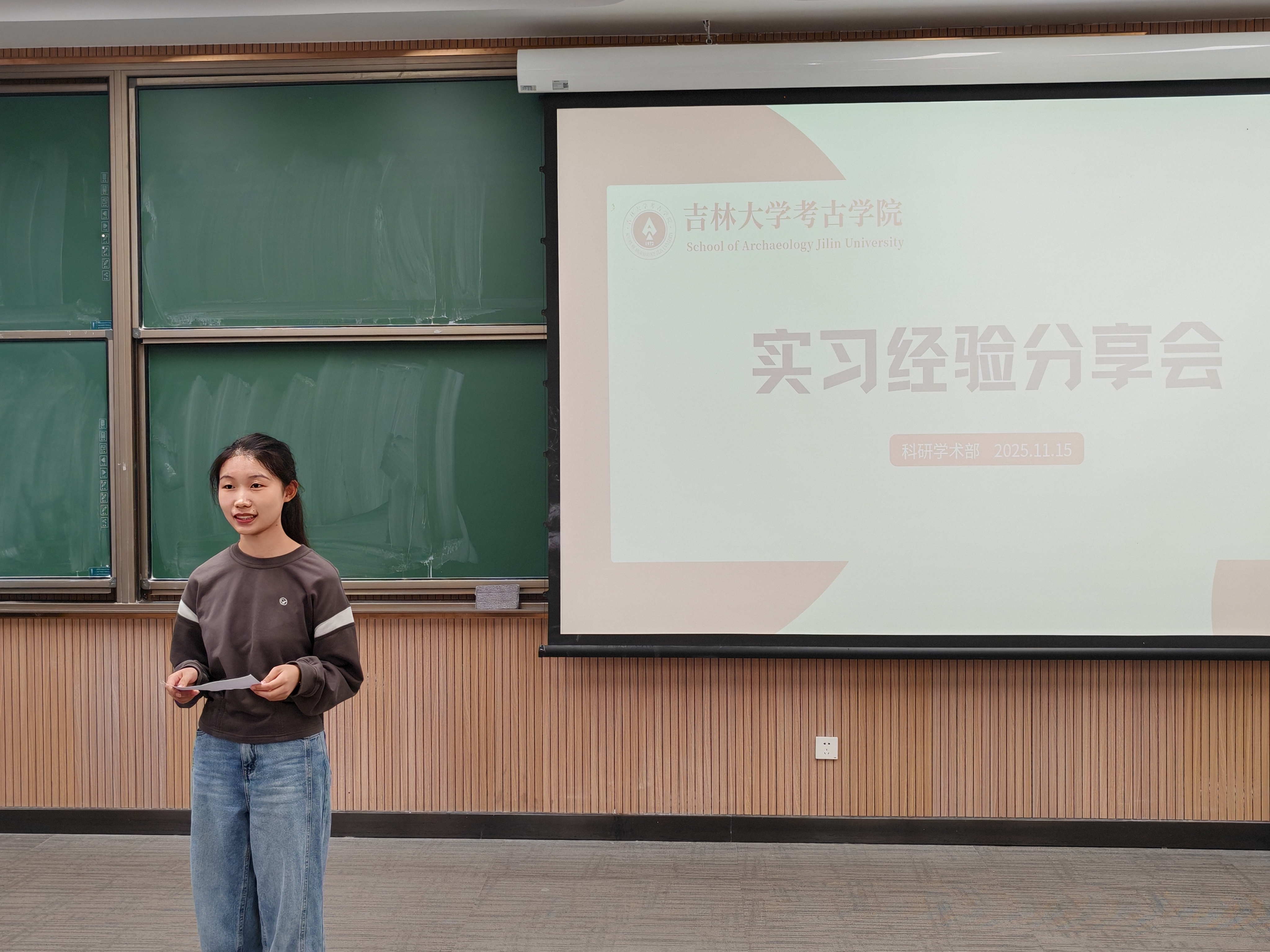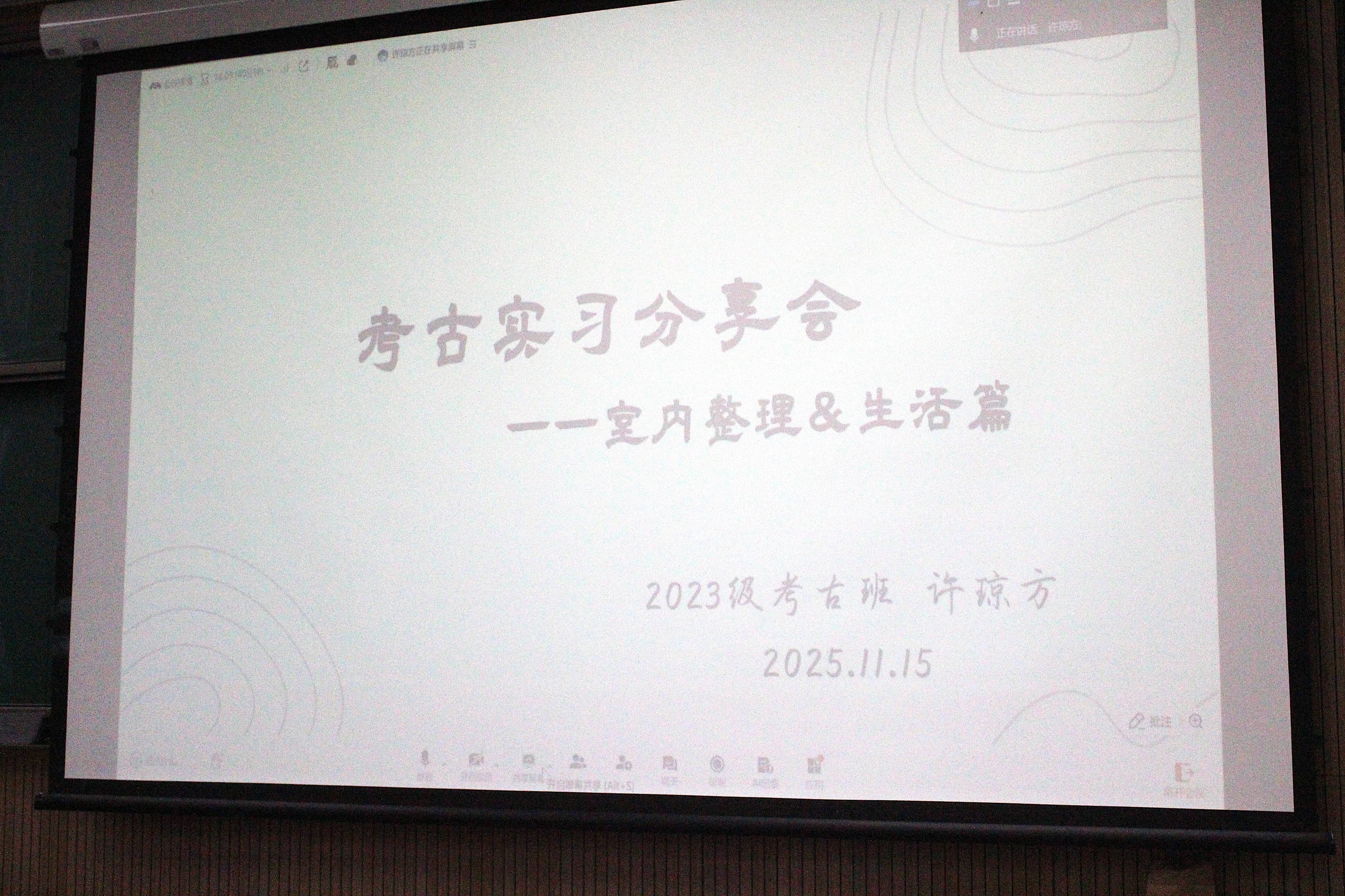 首先进行分享的是考古学专业的董欣悦。她从自身的田野实习经历出发,详细讲述了实习工作的全过程。她以自身田野实习经历为蓝本,生动还原了考古实习的完整流程,从初入田野的环境适应、实地发掘的工作方法,到团队协作中的人际沟通技巧,让在场同学对田野考古的真实场景有了直观认知。